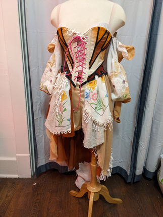 Custom look for the Vixen: corset, overskirt, shorts and 2 blouses. Complete costume needed to fit 2 diffferent performers. This was a collaborative piece built in tandem with craft artisain, Heather Duzan, we needed to pass fabrics back and forth to get the correct ombre and paint effects.
